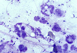 - 実際の感染症では、細胞内球菌および好中球を調査する必要がある。過剰増殖では、球菌数が増加し、それに伴い好中球がほとんど認められなくなる。